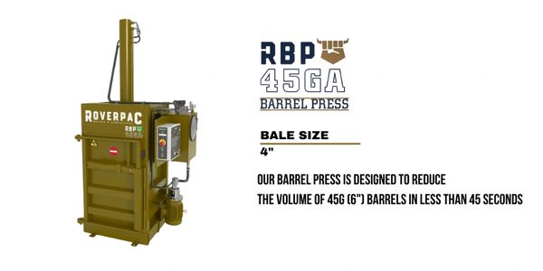 ROVERPAC’s 45 Gallon Barrel Press RBP45GA can compress 45-gallon steel drums to just 6 inches in under 45 seconds. With an integrated retention basin that allows for collection of any remaining liquids at the bottom of the barrels. The barrel press offers a range of motor options, including electric, gasoline, and diesel, ensuring that it meets your specific needs.