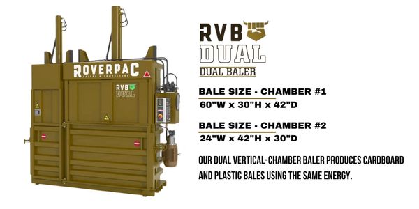 The ROVERPAC RVBDUAL Vertical Baler is a compact and efficient machine that can produce cardboard and plastic bales almost simultaneously using the same amount of power. With two bale sizes, this machine is the perfect solution for distribution centers, shopping malls, large grocery stores, and processing industries.